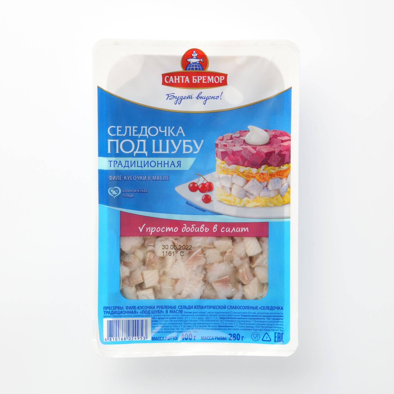 Hering pentru o salata SUBA de la producatorul „Santa Bremor” - nu este doar gustos, ci și foarte practic! Peștele este deja taiat cubulețe mici, iar vouă vă rămâne doar să-l adaugați în salată.