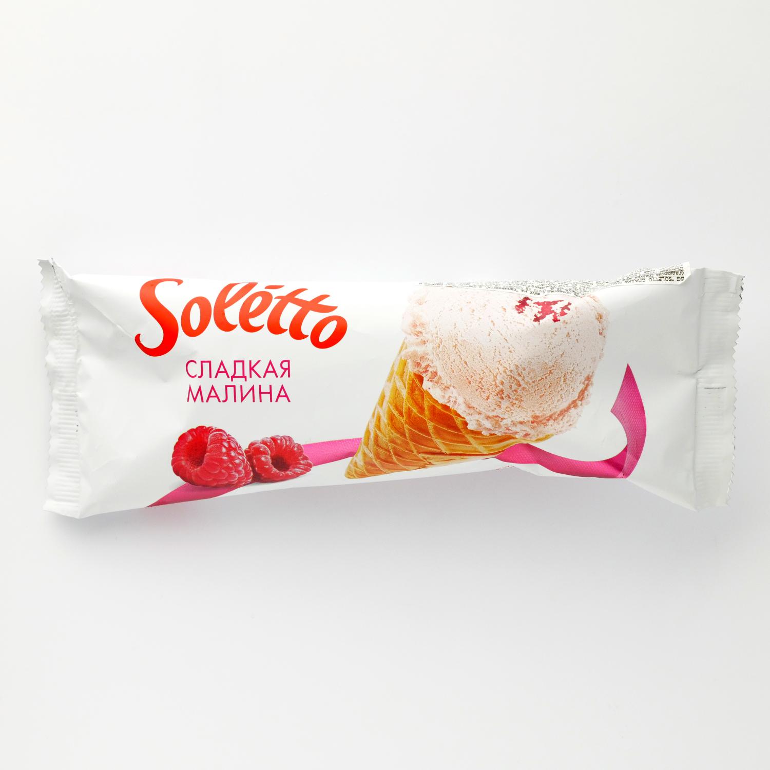 Îngheţata de la marca Soletto cu zmeură dulce este o combinaţie armonioasă de plombir cu dulceaţă de zmeură, într-un cornet de vafe crocante. În interiorul conului se află un strat subţire de glazură de ciocolată. Aroma cremoasă, cantitatea mare de umplutură și conul crocant creează acest gust unic. Cantitatea produsului este de 75 g.