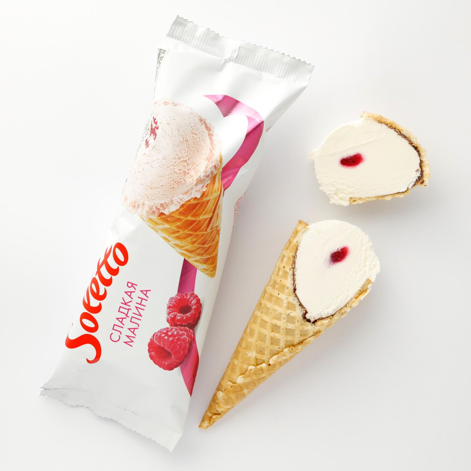 Îngheţata de la marca Soletto cu zmeură dulce este o combinaţie armonioasă de plombir cu dulceaţă de zmeură, într-un cornet de vafe crocante. În interiorul conului se află un strat subţire de glazură de ciocolată.