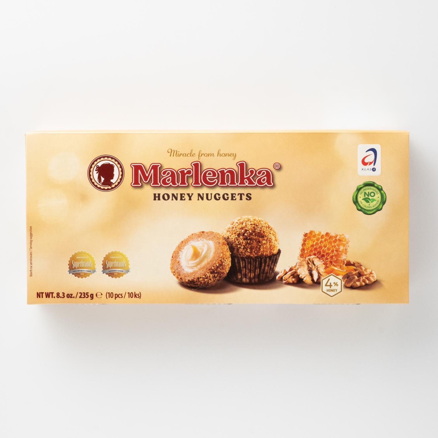 Bomboane delicioase cu miere de la producătorul "MARLENKA". Umplutura din cremă specială cu dulceață de miere se ascunde într-un înveliș crocant din nuci. Un adevărat deliciu preparat conform unei rețete armenești vechi. Un produs natural realizat fără adaos de conservanți și coloranți. Într-o cutie sunt 10 biluțe.