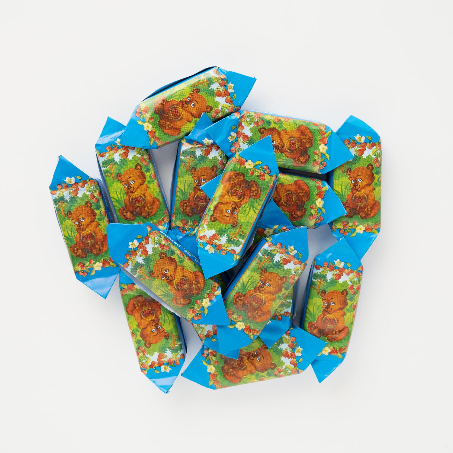 Bomboane "Mishki na poleane" de la fabrica de dulciuri belarusă "Komunarka" cu umplutură din migdale fin măcinate, pudră de cacao, unt de cacao ce se află între două foi de vafe.