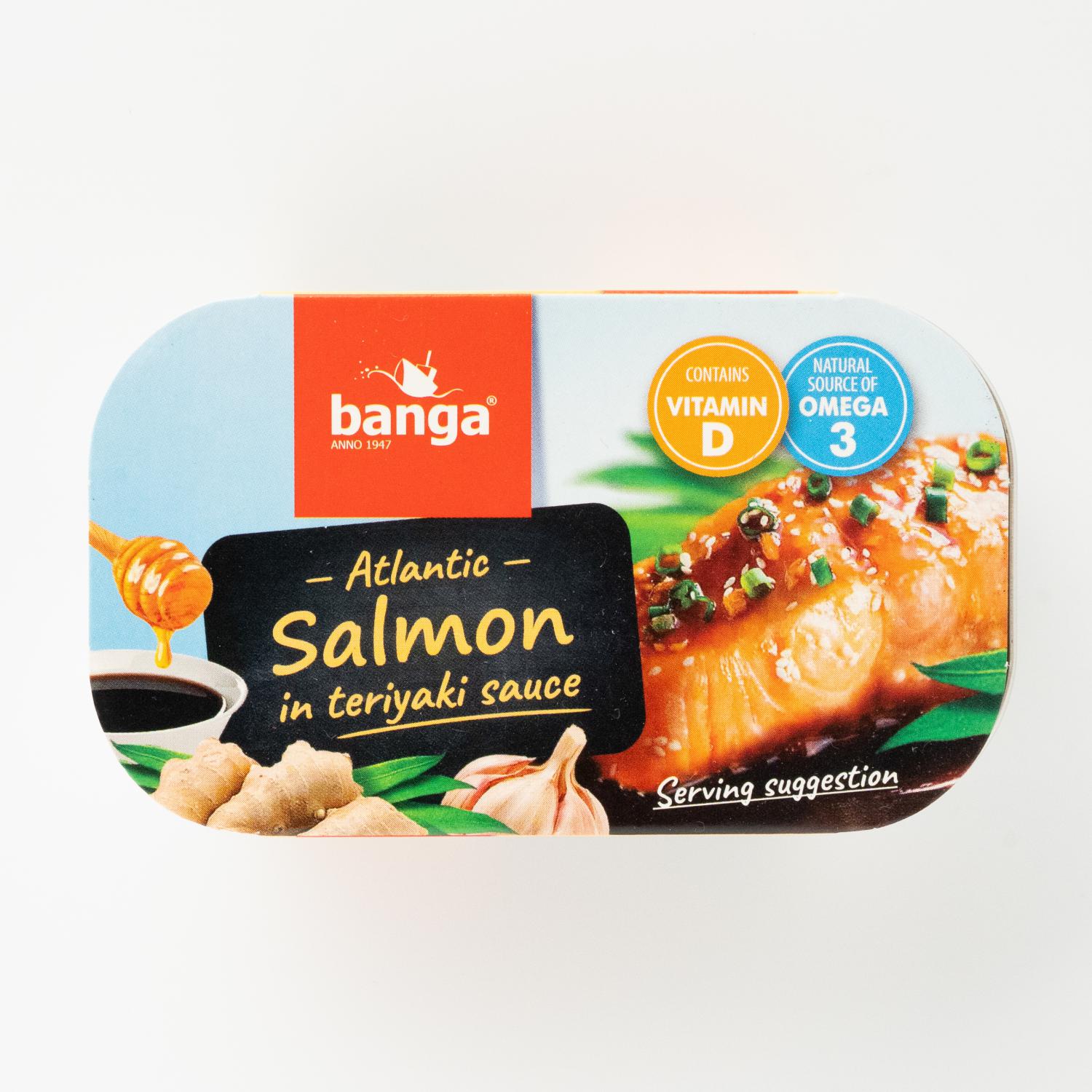 Somon conservat în sos teryiaki de la producătorul "Banga". Combinația dintre peștele roșu și sosul teriyaki creează un ansamblu unic care ne teleportează direct în Asia.