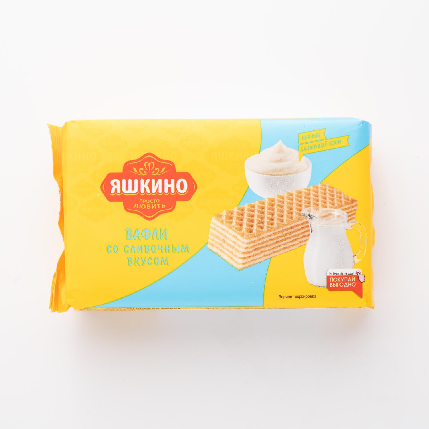 Vafele „Yashkino” cu aromă de frișcă sunt vafe delicioase crocante cu șapte straturi și cu umplutură moale de cremă. Crema are o textură moale și fragedă. Vafele au forma clasică a blocurilor dreptunghiulare. Sunt perfecte pentru micul dejun cu ceai sau pentru a face o gustare delicioasă pe care o poți savura oricând din mers!