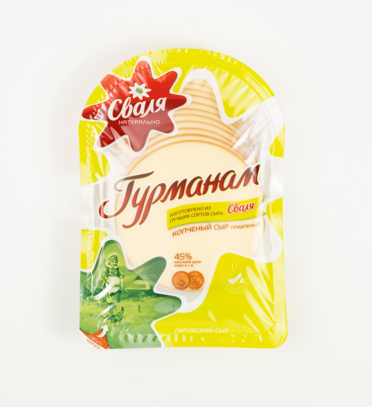 Gustul cașcavalului 45% "Gurmanams" este moderat sărat, ușor afumat, cu o consistență plăcută cremoasă. Cașcavalul se taie în bucăți subțiri rotunde, iar pentru a preveni lipirea lor, piesele sunt separate cu foi de plastic. Acesta se distinge de alte brânzeturi afumate prin gustul său blând, natural și discret. Este perfect atât pentru prepararea sandvișurilor, cât și pentru băuturi alcoolice precum vinul sau berea.